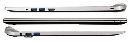 اتصالات و پورتهای به کار رفته در این لپ تاپ فرق چندانی با لپ تاپهای عادی و رایج امروزی نمیکند. به خاطر ضخامت کم، شاهد درایو نوری نیستیم. در لبه سمت چپ آن تک پورت USB 2.0 قرارگرفته و پورت شبکه Ethernet نیز با سرعت یک گیگابیت در کنار ورودی کابل شارژر در همین قسمت تعبیه شده است. بر روی لبه جلویی، فقط کارت خوان قرار گرفته است. در قسمت لبه راست دستگاه، یک پورت HDMI در کنار دو پورت USB 3.0 وجود دارد. پورت VGA نیز حذف شده است . جک 3.5 میلی متری صدا نیز بر روی همین لبه واقع شده است. ارتباط بی سیم برای این دستگاه توسط شبکه Wi-Fi با استاندارد 802.11 a/b/g/n و بلوتوث نسل چهارم میسر شده است. یک وبکم نیز بر روی لبه بالایی قاب صفحه نمایش وجود دارد که با کیفیت HD 720p قادر به تصویر برداری است. این دوربین در شرایط نوری مناسب از کیفیت خوبی برخوردار بوده و برای برقراری ارتباط تصویری کافی است.